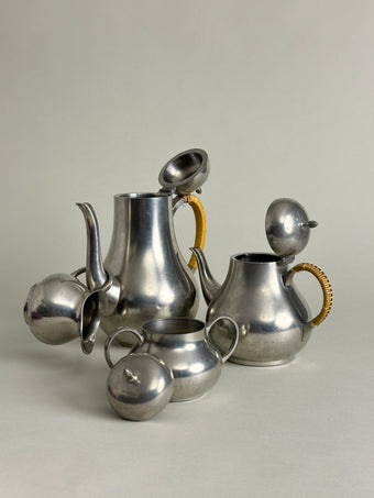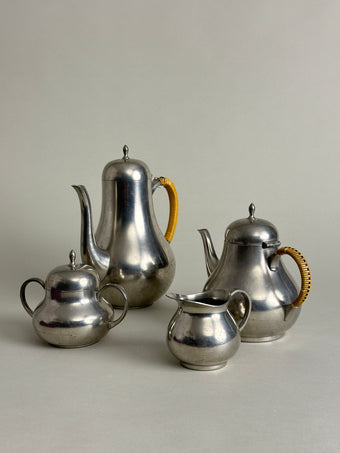 PEWTER MID CENTURY COFFEE, TEA, CREAMER, SUGAR SET