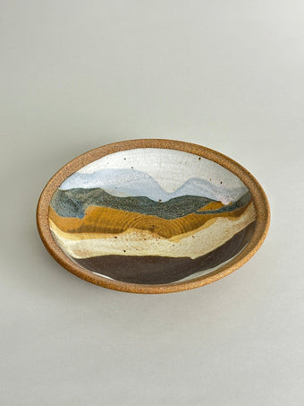 SCENIC LANDSCAPE LOW STONEWARE BOWL - MARKED HAZELTON JONES