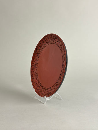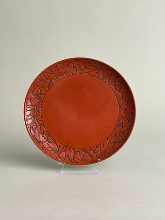 CHINESE LACQUERED WOODEN PLATE WITH CARVED FLORAL BORDER