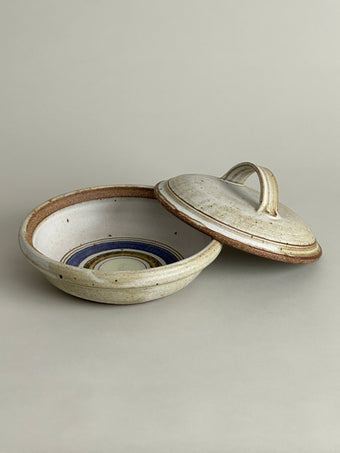 VINTAGE STONEWARE LIDDED VESSEL BLUE RINGS